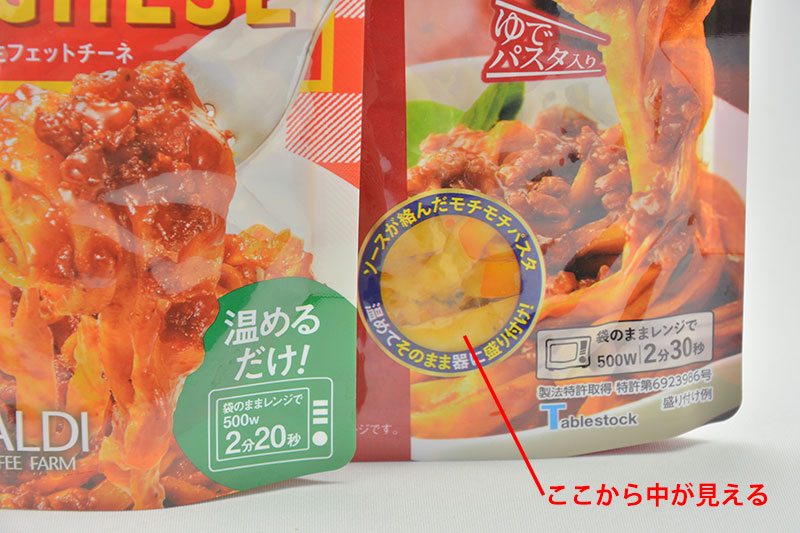 どちらもスタンドパウチに入っていますが、麺QUICKの方はパウチの一部が透明になっており、パスタが見えるようになっています。