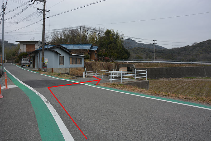 県道をくぐっておよそ130m、「そうめんの里」の駐車場の北西角を右折します。