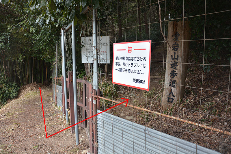 ▲「愛宕山遊歩道入口340m」と書かれた道標の立つ細い道へ入る