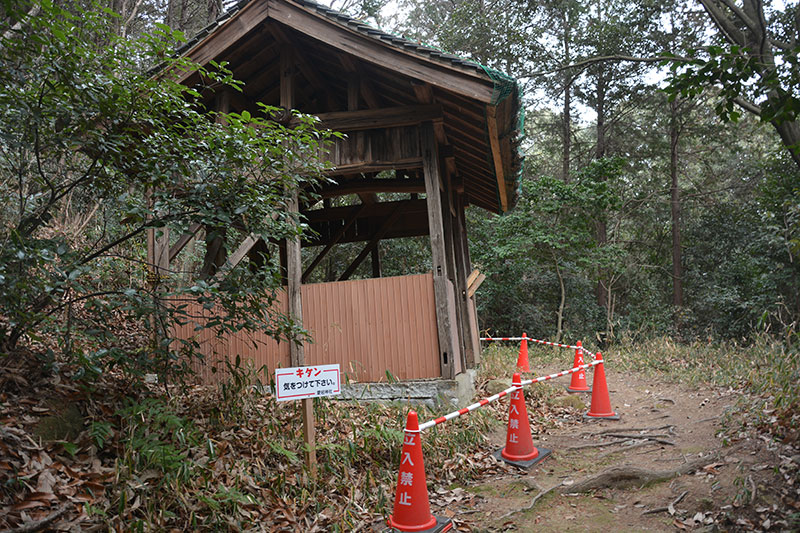 登り始めてすぐ出会う休憩小屋は、倒壊の恐れがあるためか立ち入り禁止になっていました。