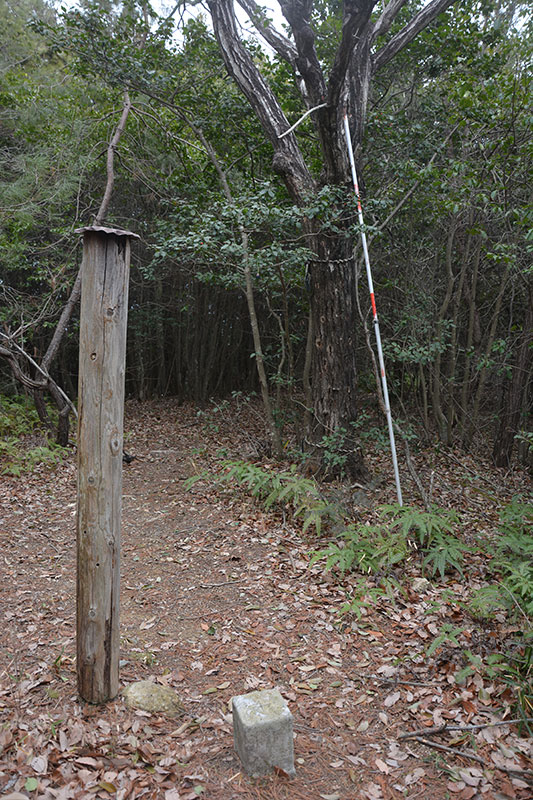 ▲三角点標石脇には測量に使用したのであろうポールが残されていた(南西方向の展望が少しだけあったので、南西からこの三角点への角度を測ったのかな)*1