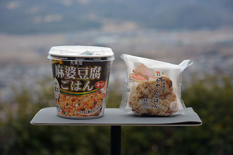 ここで頂く本日の昼食は、丸美屋の「麻婆豆腐ごはん」と「かやくごはん」のおにぎり。